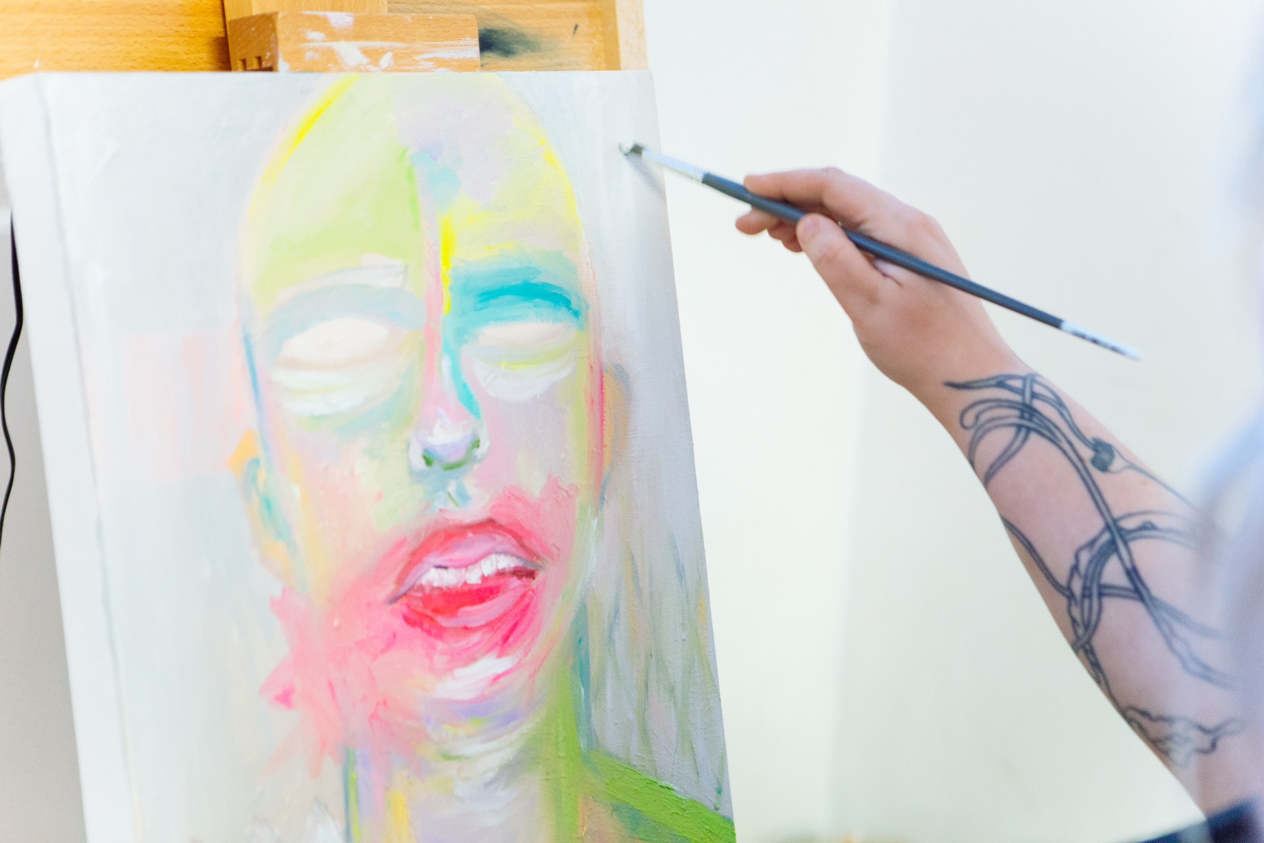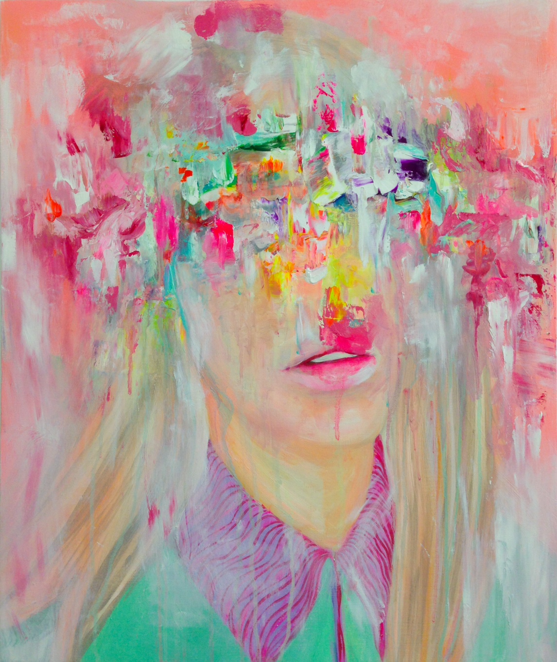 “As an artist, I’m fascinated by memory and how it shapes our identity. Over time, your mind can play tricks on you: reformulating what a loved one looked like, romanticizing past relationships gone sour, and preserving parts of memory in little packages.,, As you lose sight of what a person looks like, your mind simply begins to fill in what could have been through a form of psychological portrait. My work particularly plays with the idea of muddled psychology with the hint of facial features visible beneath the clouds of colour and fervent brushstrokes.”